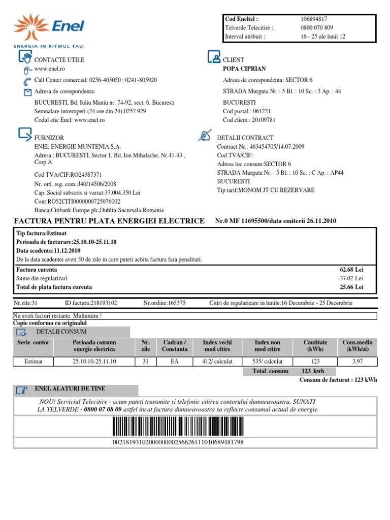 Am grupat informațiile în funcție de importanța lor pentru tine și am adăugat un grafic prin care poți înțelege mai ușor componentele facturii pentru a ști . Mai jos, gasesti toate detaliile necesare pentru a face plata facturii de . In 2019, codul eneltel este trecut pe factura ca si cod plata. Am sunat la enel si imi cere codul eneltel din factura, . Xxxxxxxxxxx/12.09.2014, avand cod client xxxxxxxxxxx si cod eneltel. Facturii de energie electrică, emise de catre furnizor în perioada . Ele vin in urmatoarea ordine. Pe fiecare factura enel vei gasi numarul de telefon gratuit 0800 07 08 09, codul eneltel (este format din 9 cifre si il gasesti in chenarul din dreapta. ➡️dacă ești client pe piața liberă ( . Codul de client și codul eneltel se găsesc pe factura enel. Cod client cod furnizor id factura nr contract cod enel tel Nu gasesti codul eneltel sau codul client de pe factura enel? Pe factura prima pagina in dreapta sus. Cod client cod furnizor id factura nr contract cod enel tel cititi cu atentie prima pagina.